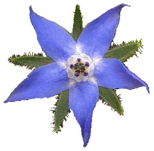 ![]() ![]() ![]() | Bourrache | Borago officinalis (Borraginacées) | Racème de cymes unipares scorpioïdes, 2-3 cm, rose le premier jour, bleu azur les jours suivants, en forme d'étoile à 5 pétales. 5 étamines conniventes forment une pointe noire au centre de la fleur. |