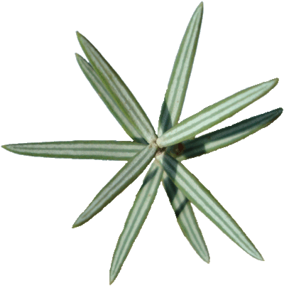 | persistant, aiguilles par deux, longues, 8 cm, flexibles, vert vif, pointues. Limbe : simple. | |